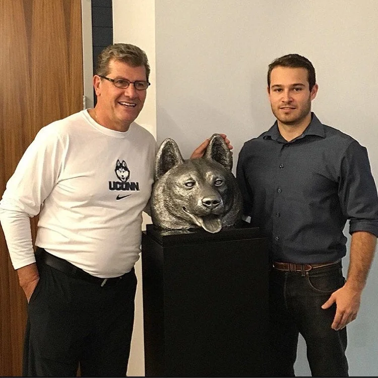 This extremely limited edition UConn husky statue has a rich history with the university's athletic program. Geno Auriemma and Kevin Ollie, two legendary UConn coaches, own the other two aluminum editions. In fact, Kevin Ollie's handmade cast aluminum sculpture has even been on display at the Werth Family UConn Basketball Champions Center on the Storrs campus to commemorate the team's historic championship run in 2014.